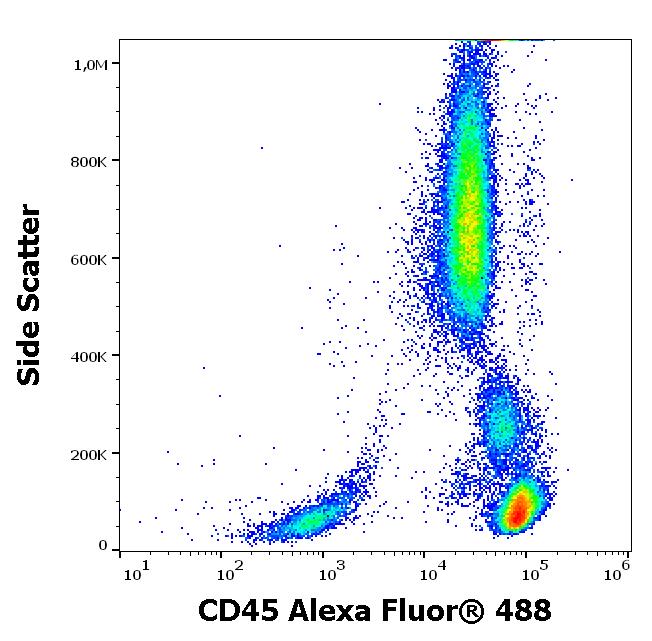 Flow cytometry surface staining pattern of human peripheral whole blood stained using anti-human CD45 (2D1) Alexa Fluor® 488 antibody (4 μl reagent / 100 μl of peripheral whole blood).