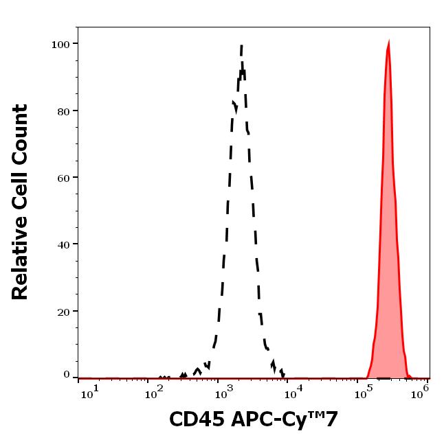 Separation of human CD45 positive lymphocytes (red-filled) from CD45 negative blood debris (black-dashed) in flow cytometry analysis (surface staining) of human peripheral whole blood stained using anti-human CD45 (MEM-28) APC-Cy™7 antibody (concentration in sample 1.67 μg/ml).