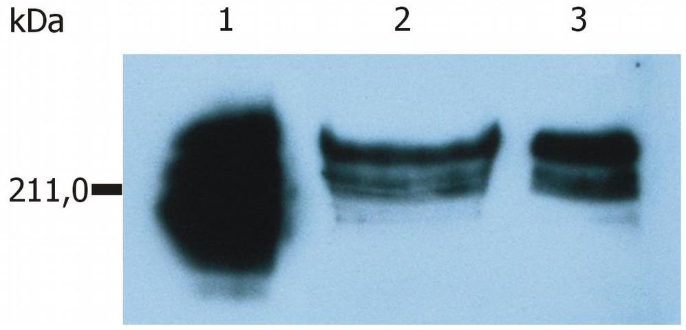 Western blotting analysis of whole cell lysate of HUT-78 human cutaneous T cell lymphoma cell line. Lane 1: immunostaining with anti-human CD45 control antibody Lane 2: immunostaining with anti-human CD45RA (MEM-56); sample of cell lysate prepared under non-reducing conditions Lane 3: immunostaining with anti-human CD45RA (MEM-56); sample of cell lysate prepared under reducing conditions