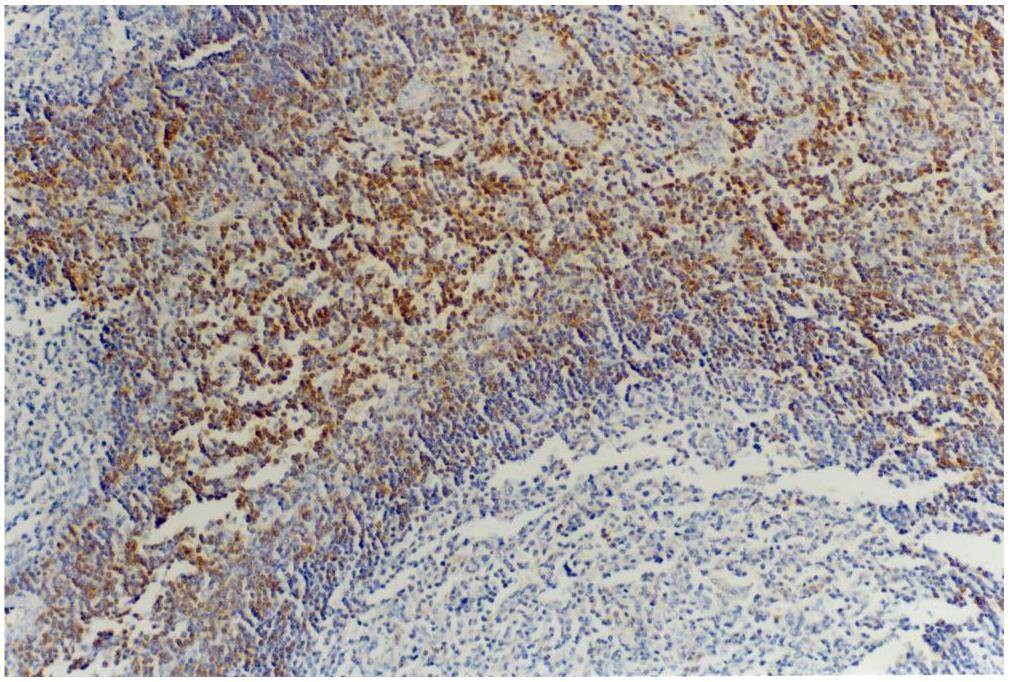 Immunohistochemistry staining of tonsil (paraffin-embedded sections) with anti-CD45RB (MEM-55).