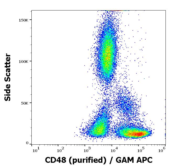 Flow cytometry surface staining pattern of human peripheral whole blood stained using anti-human CD48 (MEM-102) purified antibody (concentration in sample 3 μg/ml, GAM APC).