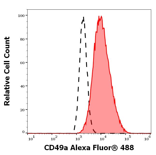 Separation of HeLa cells stained using anti-human CD49a (TS2/7) Alexa Fluor® 488 antibody (concentration in sample 0.56 μg/ml, red-filled) from HeLa cells stained using mouse IgG1 isotype control (MOPC-21) Alexa Fluor® 488 antibody (concentration in sample 0.56 μg/ml, same as CD49a Alexa Fluor® 488 concentration, black-dashed) in flow cytometry analysis (surface staining).