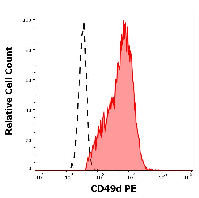 Separation of human CD49d positive lymphocytes (red-filled) from neutrophil granulocytes (black-dashed) in flow cytometry analysis (surface staining) of human peripheral whole blood stained using anti-human CD49d (9F10) PE antibody (10 μl reagent / 100 μl of peripheral whole blood).