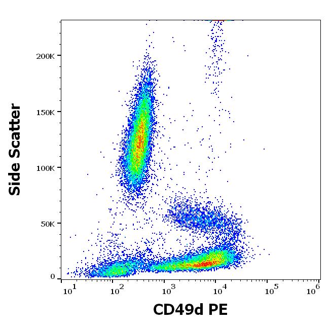 Flow cytometry surface staining pattern of human peripheral whole blood stained using anti-human CD49d (9F10) PE antibody (10 μl reagent / 100 μl of peripheral whole blood).