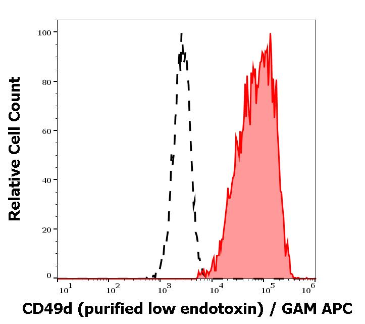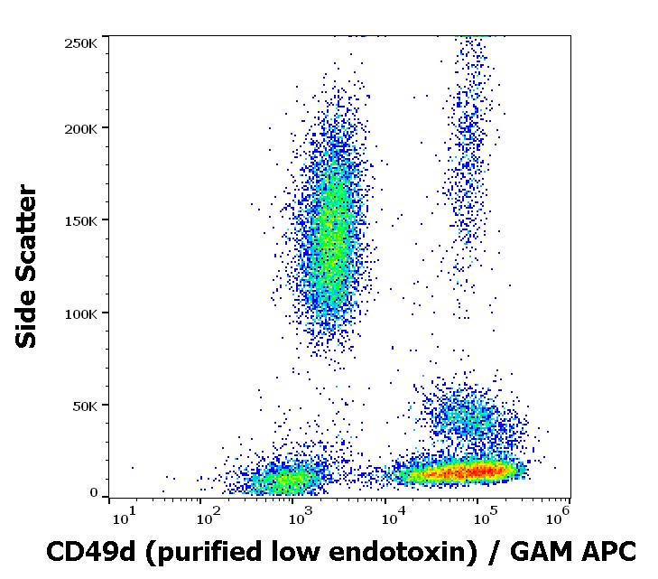 Flow cytometry surface staining pattern of human peripheral whole blood stained using anti-human CD49d (9F10) purified antibody (low endotoxin, concentration in sample 1 μg/ml) GAM APC.