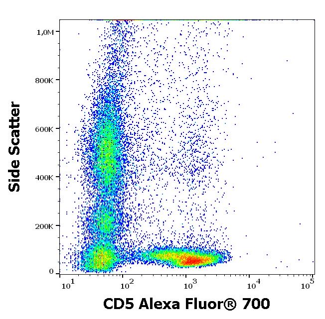 Flow cytometry surface staining pattern of human peripheral whole blood stained using anti-human CD5 (L17F12) Alexa Fluor® 700 antibody (4 μl reagent / 100 μl of peripheral whole blood).