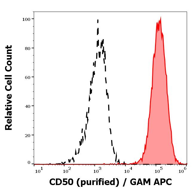 Separation of human lymphocytes (red-filled) from CD50 negative blood debris (black-dashed) in flow cytometry analysis (surface staining) of peripheral whole blood stained using anti-human CD50 (MEM-171) purified antibody (concentration in sample 0,6 μg/ml, GAM APC).