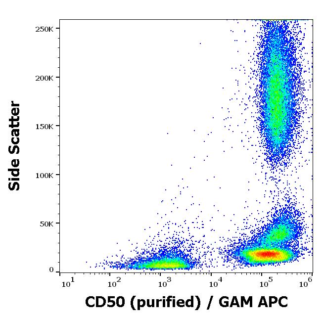 Flow cytometry surface staining pattern of human peripheral whole blood stained using anti-human CD50 (MEM-171) purified antibody (concentration in sample 0,6 μg/ml, GAM APC).