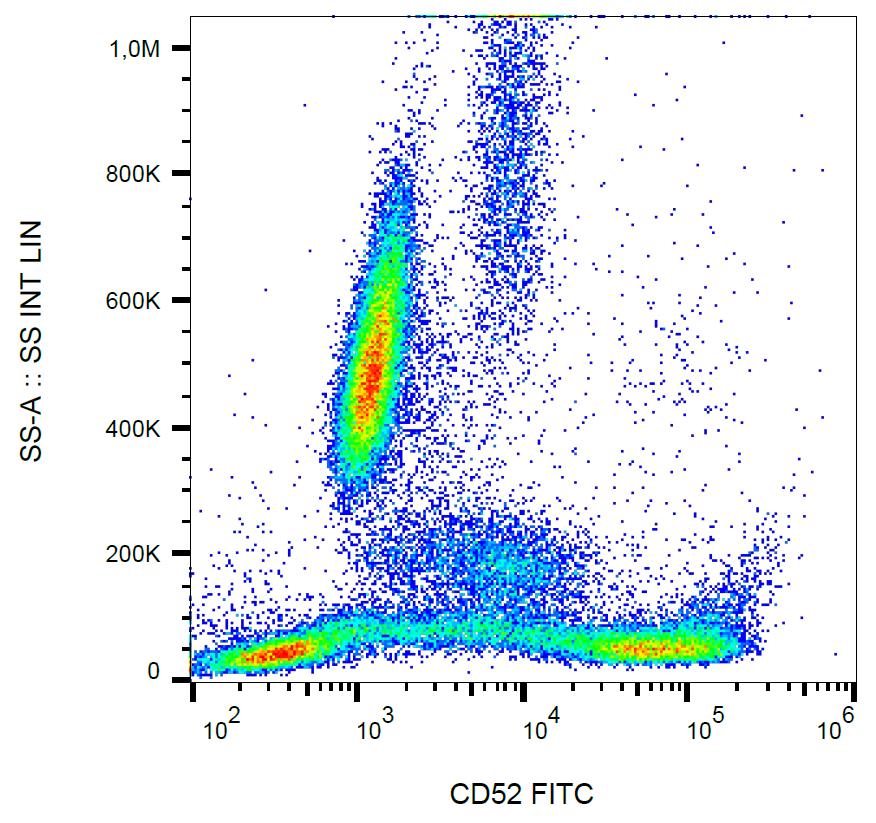 Flow cytometry analysis (surface staining) of CD52 in human peripheral blood with anti-CD52 (HI186) FITC.