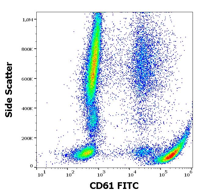 Flow cytometry surface staining pattern of human peripheral whole blood stained using anti-human CD61 (VIPL2) FITC antibody (4 μl reagent / 100 μl of peripheral whole blood).