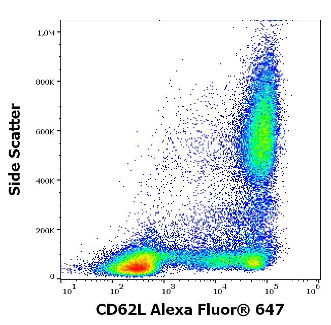 Flow cytometry surface staining pattern of human peripheral whole blood stained using anti-human CD62L (DREG56) Alexa Fluor® 647 antibody (concentration in sample 1 μg/ml).