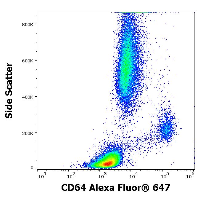 Flow cytometry surface staining pattern of human peripheral whole blood stained using anti-human CD64 (10.1) Alexa Fluor® 647 antibody (4 μl reagent / 100 μl of peripheral whole blood).