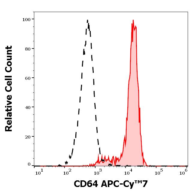 Separation of human monocytes (red-filled) from lymphocytes (black-dashed) in flow cytometry analysis (surface staining) of human peripheral whole blood stained using anti-human CD64 (10.1) APC-Cy™7 antibody (4 μl reagent / 100 μl of peripheral whole blood).