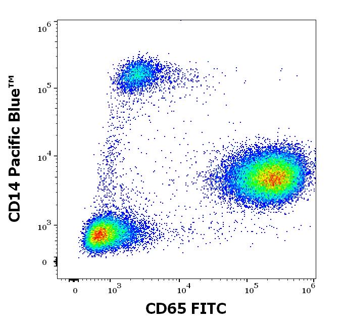Flow cytometry multicolor surface staining pattern of human leukocytes stained using anti-human CD14 (MEM-15) Pacific Blue™ antibody (4 μl reagent / 100 μl of peripheral whole blood) and anti-human CD65 (VIM8) FITC antibody (4 μl reagent / 100 μl of peripheral whole blood).