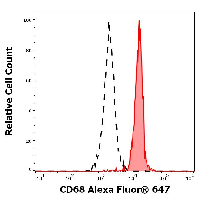 Separation of human monocytes (red-filled) from lymphocytes (black-dashed) in flow cytometry analysis (intracellular staining) of human peripheral whole blood stained using anti-human CD68 (Y1/82A) Alexa Fluor® 647 antibody (4 μl reagent / 100 μl of peripheral whole blood).