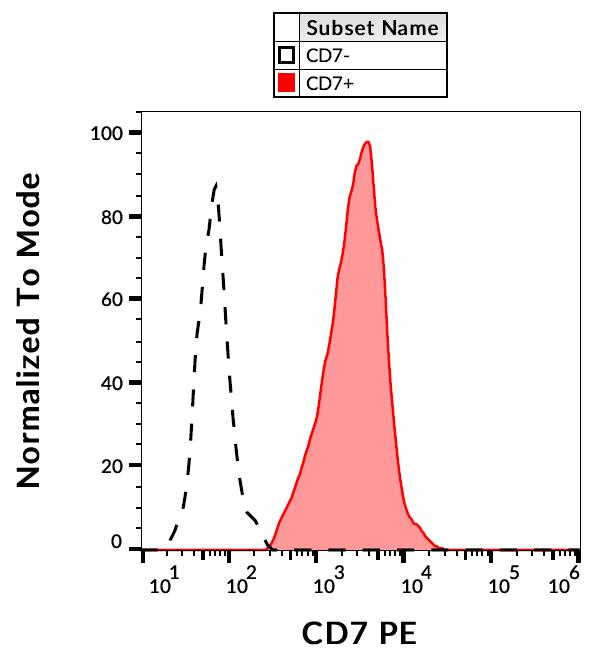 Flow cytometry analysis (surface staining) of human peripheral blood with anti-human CD7 (124-1D1) PE.