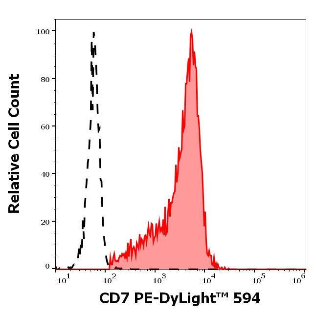 Separation of human CD7 positive lymphocytes (red-filled) from neutrophil granulocytes (black-dashed) in flow cytometry analysis (surface staining) of human peripheral whole blood stained using anti-human CD7 (MEM-186) PE-DyLight™ 594 antibody (concentration in sample 0.56 μg/ml).