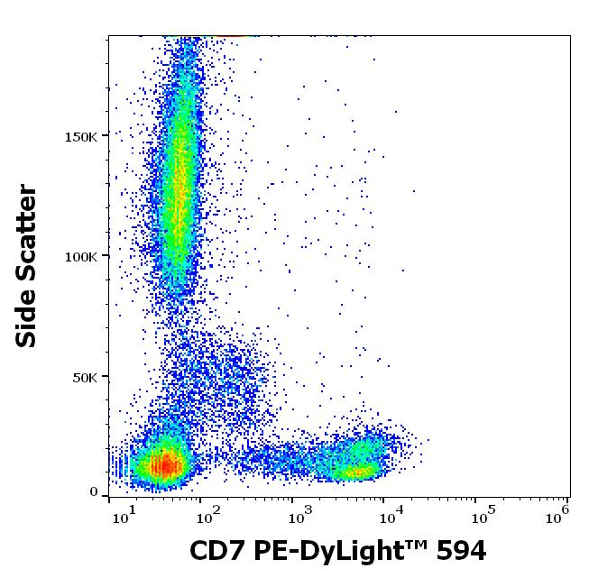 Flow cytometry surface staining pattern of human peripheral whole blood stained using anti-human CD7 (MEM-186) PE-DyLight™ 594 antibody (concentration in sample 0.56 μg/ml).