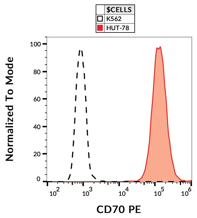 Flow cytometry analysis (surface staining) of HUT-78 and K562 cell lines with anti-human CD70 (Ki-24) PE.
