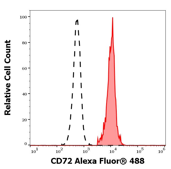 Separation of human CD72 positive lymphocytes (red-filled) from CD72 negative lymphocytes (black-dashed) in flow cytometry analysis (surface staining) of human peripheral whole blood stained using anti-human CD72 (3F3) Alexa Fluor® 488 antibody (4 μl reagent / 100 μl of peripheral whole blood).