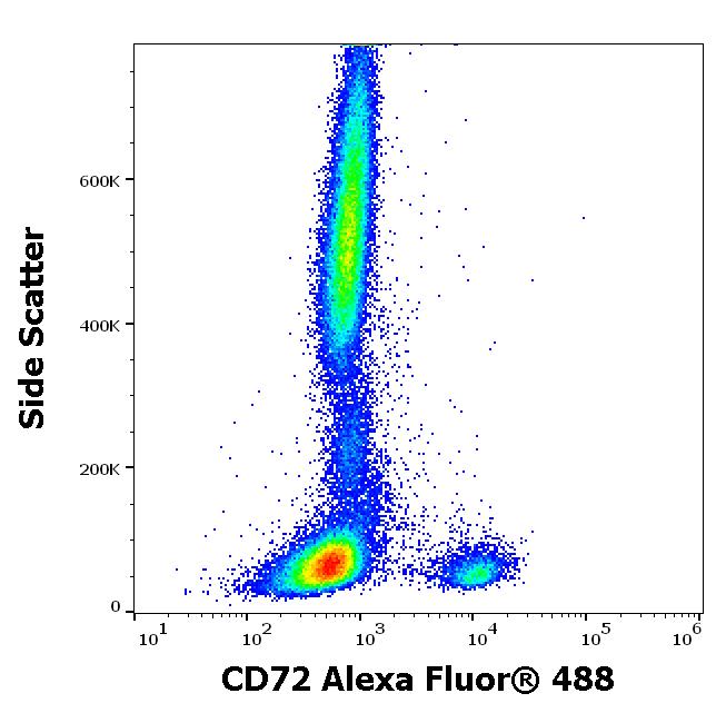 Flow cytometry surface staining pattern of human peripheral whole blood stained using anti-human CD72 (3F3) Alexa Fluor® 488 antibody (4 μl reagent / 100 μl of peripheral whole blood).