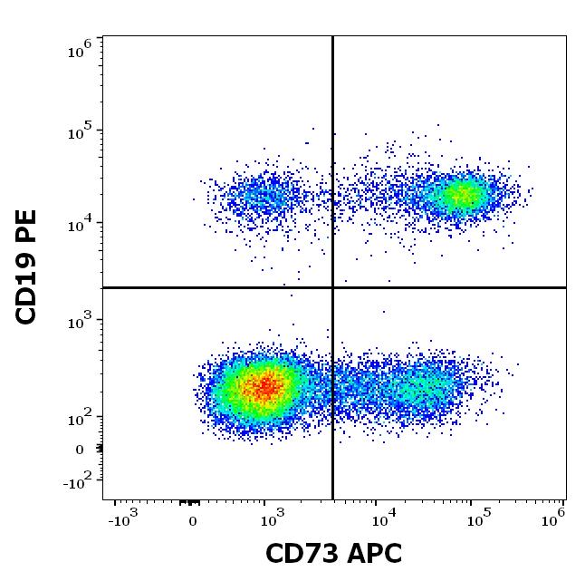 Flow cytometry multicolor surface staining pattern of human lymphocytes using anti-human CD73 (AD2) APC antibody (10 μl reagent / 100 μl of peripheral whole blood) and anti-human CD19 (LT19) PE antibody(20 μl reagent / 100 μl of peripheral whole blood).