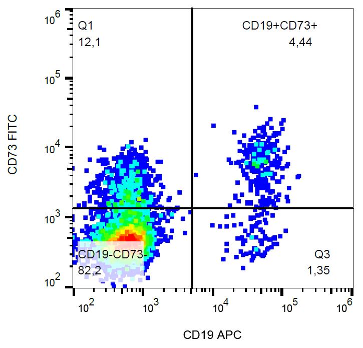 CD73 (ecto-5´-nucleotidase) is a 70 kDa glycoprotein anchored to the extracellular leaflet of the plasma membrane by GPI. This ecto-enzyme catalyzes dephosphorylation of AMP to adenosine. CD73 is expressed in various types of cells, such as epithelial, muscle, and endothelial cells, neutrophils, lymphocytes and fibroblasts. Inflammatory mediators support CD73 expression and its enzymatic activity, leading to the release of adenosine, which modulates inflammation through adenosine receptors. CD73 is expressed in a variety of lymphomas and leukemias, including ALL and CLL, whereas immunodeficient patients usually express low levels of this protein.