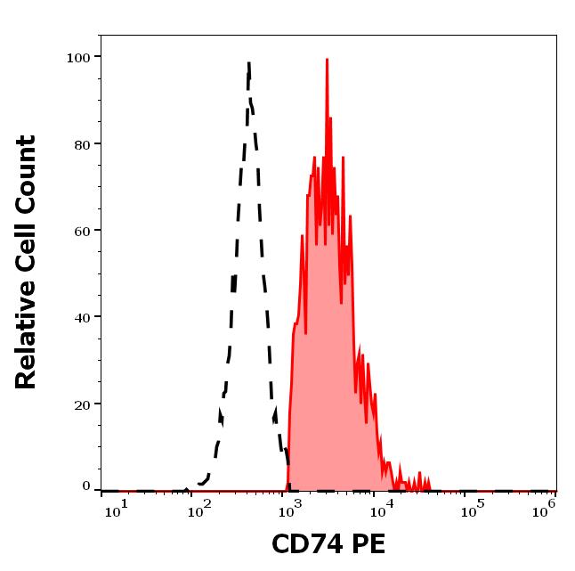 Separation of human CD74 positive B cells (red-filled) from CD74 negative CD19 negative lymphocytes (black-dashed) in flow cytometry analysis (surface staining) of human peripheral whole blood stained using anti-human CD74 (LN2) PE antibody (20 μl reagent / 100 μl of peripheral whole blood).
