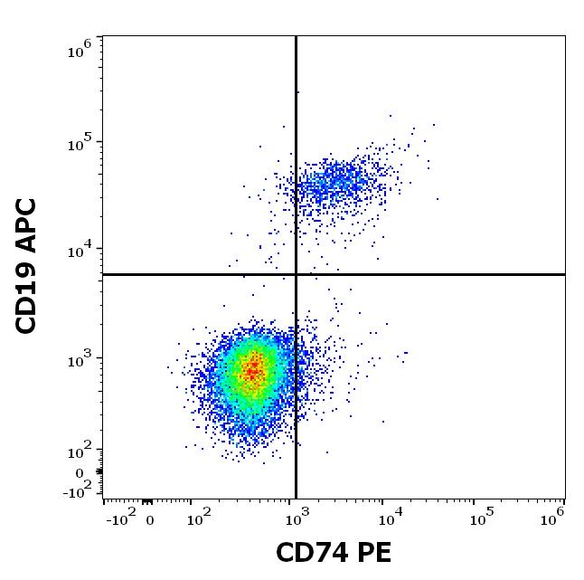 Flow cytometry multicolor surface staining of human lymphocytes stained using anti-human CD19 (4G7) APC antibody (10 μl reagent / 100 μl of peripheral whole blood) and anti-human CD74 (LN2) PE antibody (20 μl reagent / 100 μl of peripheral whole blood).