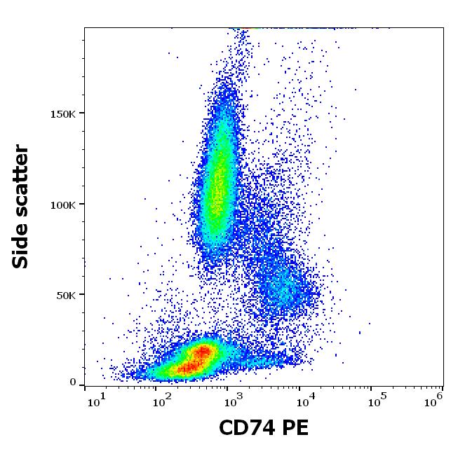 Flow cytometry surface staining pattern of human peripheral whole blood stained using anti-human CD74 (LN2) PE antibody (20 μl reagent / 100 μl of peripheral whole blood).