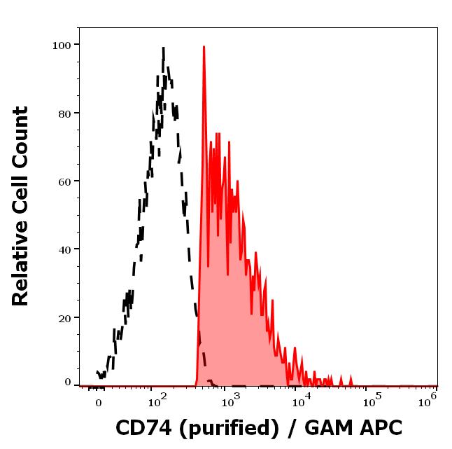 Separation of human CD74 positive lymphocytes (red-filled) from CD74 negative lymphocytes (black-dashed) in flow cytometry analysis (surface staining) of human peripheral whole blood stained using anti-human CD74 (LN2) purified antibody (concentration in sample 1,7 μg/ml, GAM APC).