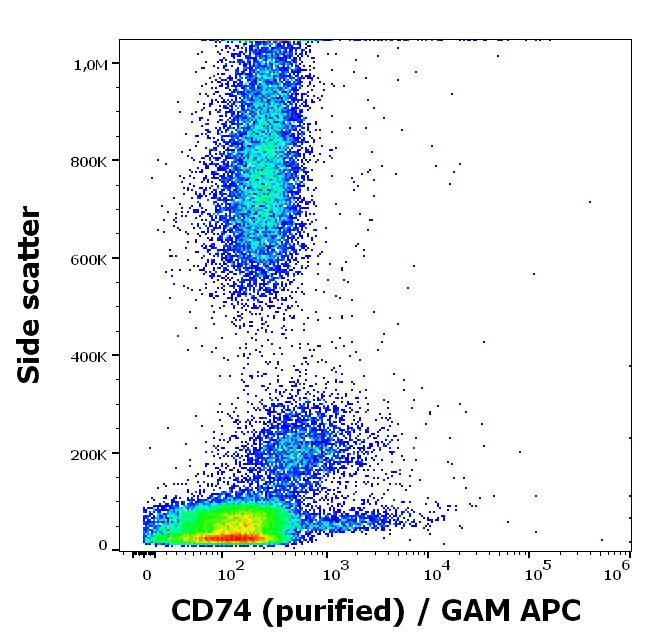 Flow cytometry surface staining pattern of human peripheral whole blood stained using anti-human CD74 (LN2) purified antibody (concentration in sample 1,7 μg/ml, GAM APC).