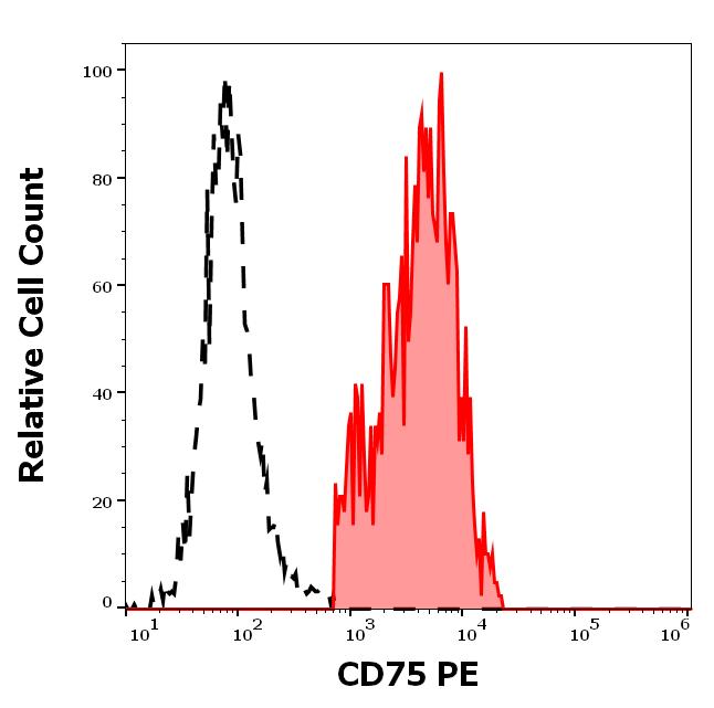Separation of human CD75 positive lymphocytes (red-filled) from CD75 negative lymphocytes (black-dashed) in flow cytometry analysis (surface staining) of human peripheral whole blood stained using anti-human CD75 (LN1) PE antibody (10 μl reagent / 100 μl of peripheral whole blood).