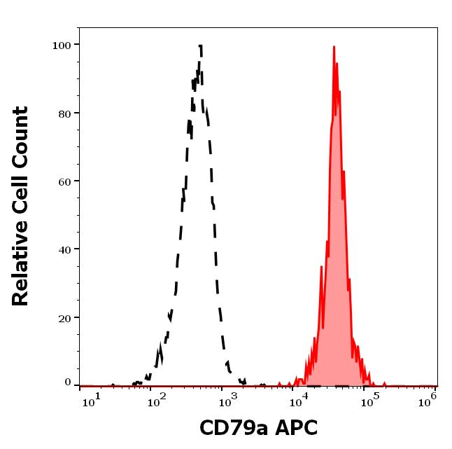 Separation of human CD79a positive B cells (red-filled) from CD79a negative CD19 negative lymphocytes (black-dashed) in flow cytometry analysis (intracellular staining) of human peripheral whole blood stained using anti-human CD79a (HM57) APC antibody (concentration in sample 1 μg/ml).