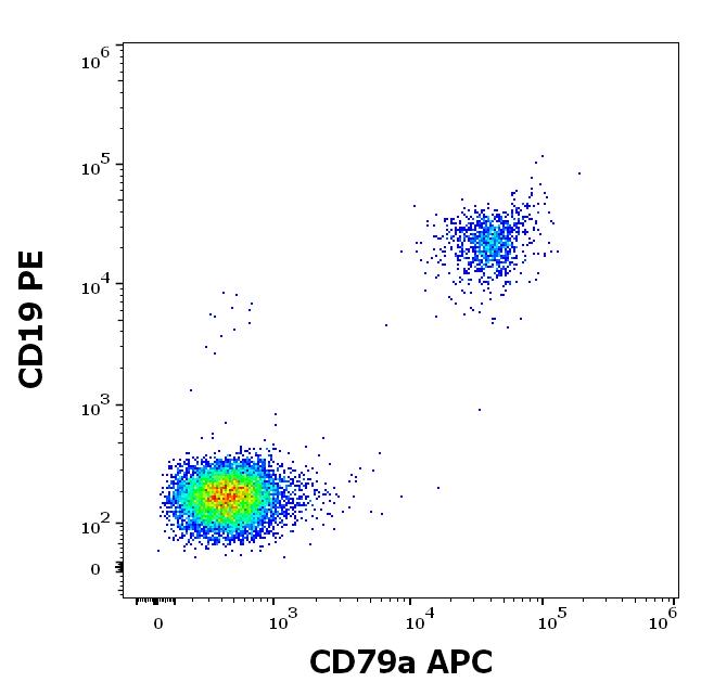 Flow cytometry multicolor intracellular staining pattern of human lymphocytes stained using anti-human CD19 (LT19) PE antibody (20 μl reagent / 100 μl of peripheral whole blood) and anti-human CD79a (HM57) APC antibody (concentration in sample 1 μg/ml).