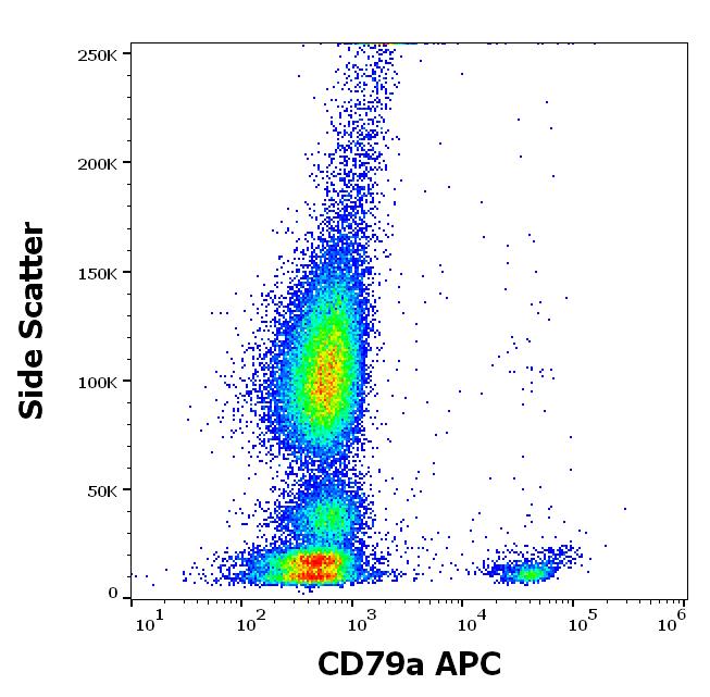 Flow cytometry infracellular staining pattern of human peripheral whole blood stained using anti-human CD79a (HM57) APC antibody (concentration in sample 1 μg/ml).