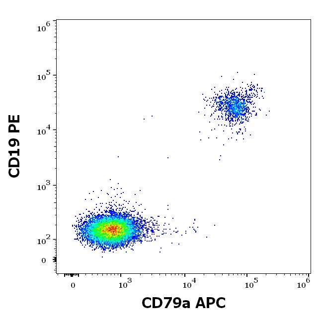 Flow cytometry multicolor surface staining pattern of human lymfocytes stained using anti-human CD19 (LT19) PE antibody (20 μl reagent / 100 μl of peripheral whole blood) and intracellular staining pattern using anti-human CD79a (HM47) APC antibody (concentration in sample 1 μg/ml).