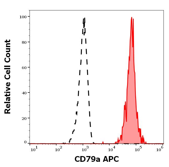 Separation of human CD79a positive CD19 positive B cells (red-filled) from CD79a negative CD19 negative lymphocytes (black-dashed) in flow cytometry analysis (intracellular staining) of human peripheral whole blood stained using anti-human CD79a (HM47) APC antibody (concentration in sample 1 μg/ml).
