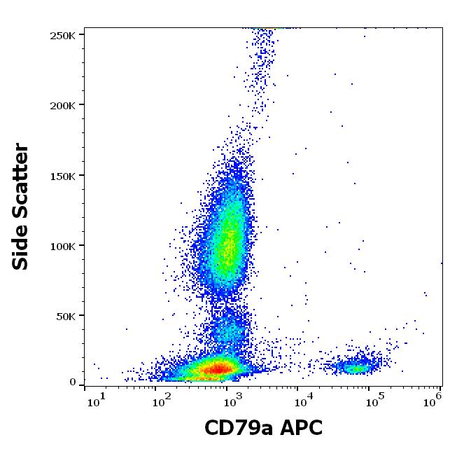 Flow cytometry intracellular staining pattern of human peripheral whole blood stained using anti-human CD79a (HM47) APC antibody (concentration in sample 1 μg/ml).