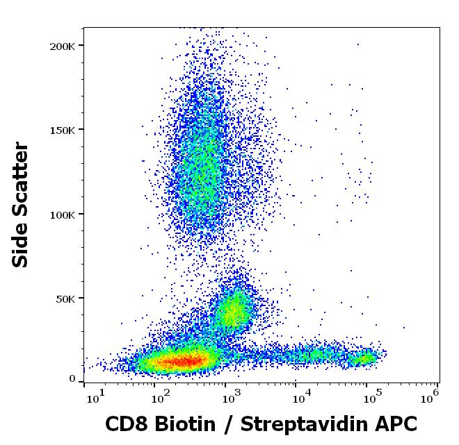 Flow cytometry surface staining pattern of human peripheral whole blood stained using anti-human CD8 (MEM-31) biotin antibody (concentration in sample 0.3 μg/ml, Streptavidin APC).
