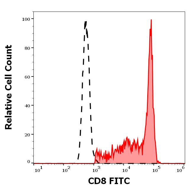 Separation of human CD8 positive lymphocytes (red-filled) from neutrophil granulocytes (black-dashed) in flow cytometry analysis (surface staining) of human peripheral whole blood stained using anti-human CD8 (MEM-31) FITC antibody (20 μl reagent / 100 μl of peripheral whole blood).