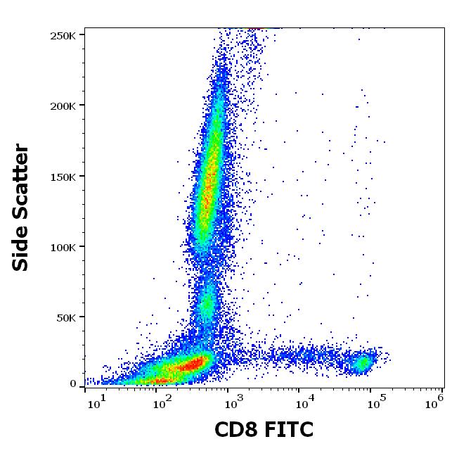 Flow cytometry surface staining pattern of human peripheral whole blood stained using anti-human CD8 (MEM-31) FITC antibody (20 μl reagent / 100 μl of peripheral whole blood).