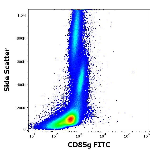 Flow cytometry surface staining pattern of human peripheral whole blood stained using anti-human CD85g (17G10.2) FITC antibody (4 μl reagent / 100 μl of peripheral whole blood).