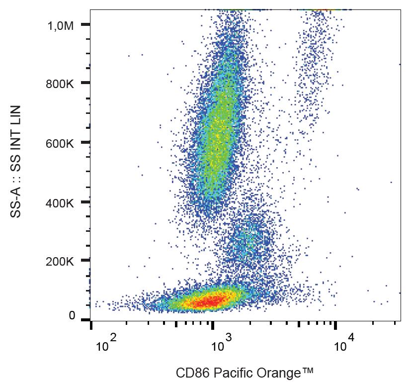 Flow cytometry analysis (surface staining) of human peripheral blood cells with anti-CD86 (BU63) Pacific Orange™.