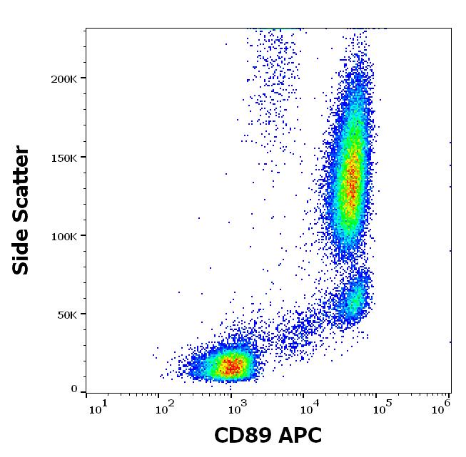 Flow cytometry surface staining pattern of human peripheral whole blood stained using anti-human CD89 (A59) APC antibody (10 μl reagent / 100 μl of peripheral whole blood).
