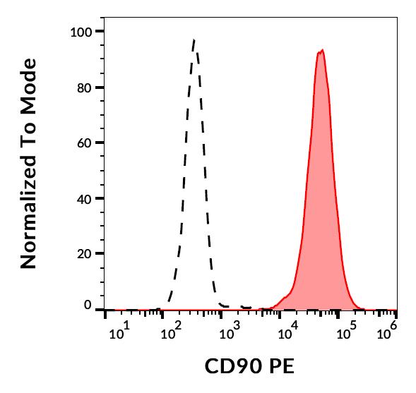 Separation of Jurkat cells (red-filled) from SP2 cells (black-dashed) in flow cytometry analysis (surface staining) stained using anti-human CD90 (5E10) PE antibody (10 μl reagent per milion cells in 100 μl of cell suspension).