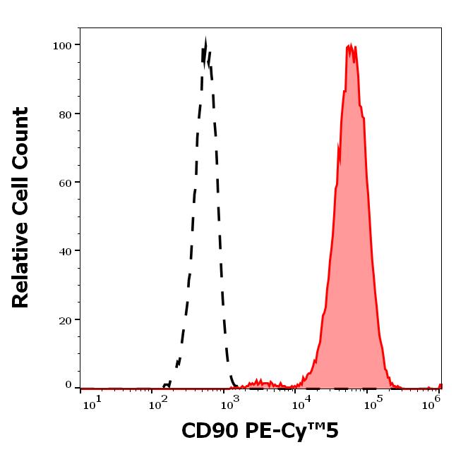 Separation of Jurkat cells stained using anti-human CD90 (5E10) PE-Cy™5 antibody (concentration in sample 5 μg/ml, red-filled) from Jurkat cells stained using mouse IgG1 isotype control (MOPC-21) PE-Cy™5 antibody (concentration in sample 5 μg/ml, same as CD90 PE-Cy™5 concentration, black-dashed) in flow cytometry analysis (surface staining).