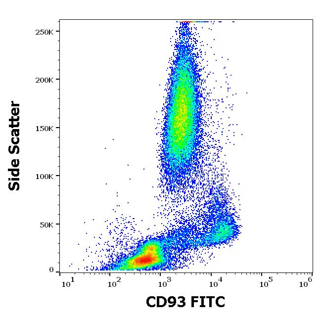 Flow cytometry surface staining pattern of human peripheral whole blood stained using anti-human CD93 (VIMD2) FITC antibody (4 μl reagent / 100 μl of peripheral whole blood).