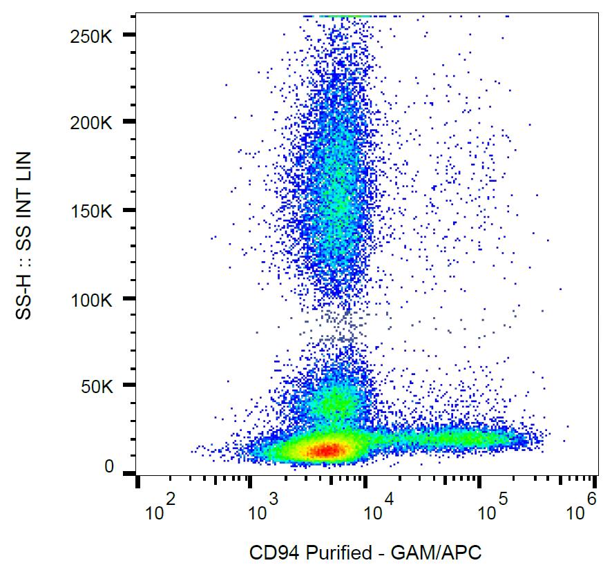 CD94, also known as KLRD1 (killer cell lectin-like receptor D1), is a transmembrane glycoprotein of the C-type lectin family, which forms disulfide-linked heterodimers with NKG2A, B, C, E, H proteins, constituting functionally distinct receptors of NK cells and related cell types. CD94/NKG2A and CD94/NKG2B heterodimers serve as inhibitory, whereas CD94/NKG2C and CD94/NKG2E as activating receptors. The ligand for CD94/NKG2 complexes has been identified as HLA-E. Extent of CD94 expression on NK cell surface can be used to demonstrate their progress through the differentiation process.