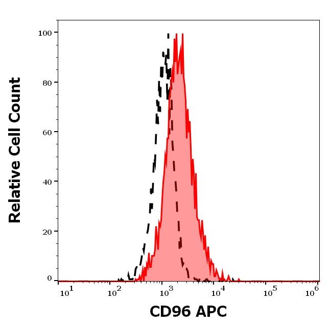 Separation of PHA stimulated lymphocytes stained using anti-human CD96 (NK92.39) APC antibody (10 μl reagent per million cells in 100 μl of cell suspension, red-filled) from PHA stimulated lymphocytes stained using mouse IgG1 isotype control (MOPC-21) APC antibody (concentration in sample 5 μg/ml, same as Galectin-3 APC concentration, black-dashed) in flow cytometry analysis (surface staining) of PHA stimulated peripheral blood cells.